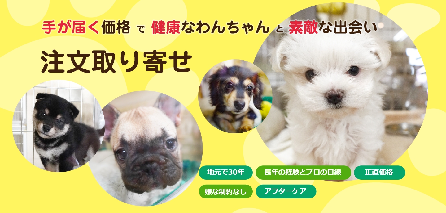 当店で生まれた仔犬、または、お客様よりご希望をいただいたわんちゃん(注文取り寄せ)のどちらかにてご紹介させていただいております。